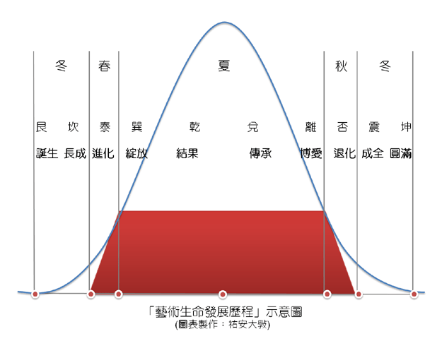 在「藝術創作思維」方面,除了重新定義「藝術」,還賦予「藝術創作」全新內涵,描繪藝術發展「最高境界」,演繹「藝術生命」發展思維,也制訂藝術創作「評價標準」,並首度揭露第一個八階段「藝術生命發展歷程」。