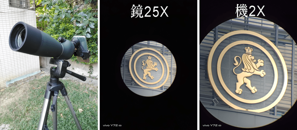 在此方案中,筆者選擇的是25X-75X賞鳥望遠鏡,價格約NT$1,600,預期效果(鏡25X)(機2X5)=25-250倍。安裝後外觀如下方左圖,目標物放大25倍如下方中圖,手機調焦影像放大2倍後如下方右圖。