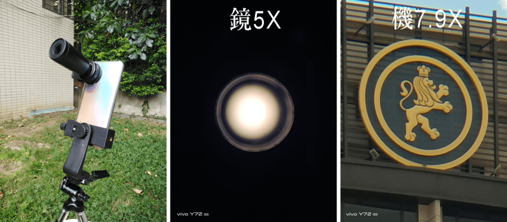 在此方案中,筆者選擇的是37mm 5X增距鏡,價格約為NT$770元,37mm手機夾約$50元,合計約NT$820元,預期效果(鏡5X)(機2X5)=5-50倍。安裝後外觀如下方左圖,目標物放大5倍如下方中圖,手機調焦影像放大7.9倍後如下方右圖。