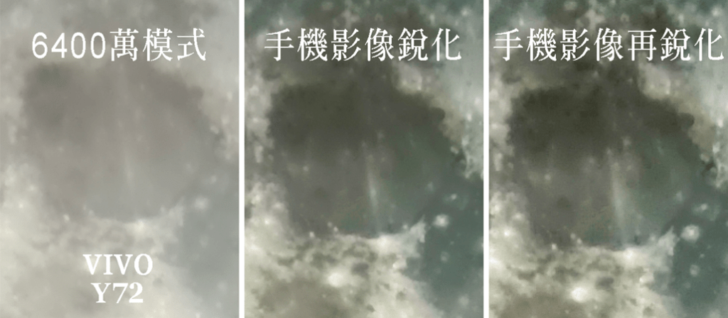 將VIVO Y72 裝上手機架並掛在75倍望遠鏡的目鏡後,分別以「6,400萬模式」與「專業模式」拍攝月球,結果如下圖。