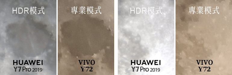 分別以1300萬畫素的Huawei Y7 Pro 2019「HDR模式」與1600萬畫素的VIVO Y72「專業模式」拍攝月球,結果如下圖。