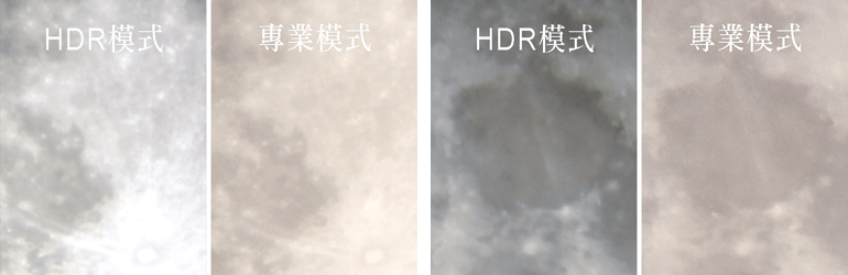 將Huawei Y7 Pro 2019 裝上手機架並掛在75倍望遠鏡的目鏡後,分別以「HDR模式」與「專業模式」拍攝月球,結果如下圖。