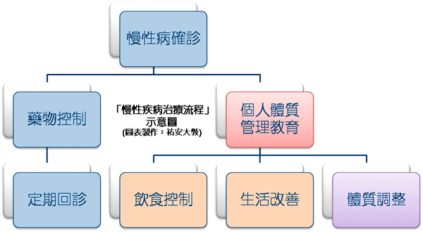 總之,加強個人身體健康管理之教育,以縮短療程、減少用藥,盡速回復正常飲食、生活自理,才是治療慢性疾病的根本之道。