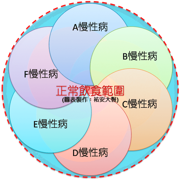 「飲食控制」的用意,在於避免或減少攝取禁忌食物,實際上卻很難執行。並且,絕大多數病患本身的飲食習慣與內容本身就存在若干問題,才會造成各種慢性疾病,期望病患自行改善根本是一種不切實際的奢望。特別是痛風、心臟血管等疾病患者,過多要減少攝取的禁忌食物,反而容易造成病患營養攝取更不均衡,並導致營養不良、體質更差。又如為追求飲食清淡,反而不吃薑蒜,導致身體越來越虛。此外,規避禁忌食物的作法過於消極,且容易被誤解,應該有更理想、更正向的作法才對。此外,所有含「咖啡因」的食物飲品,也是所有慢性病患必須禁用的,卻很少有人提及。