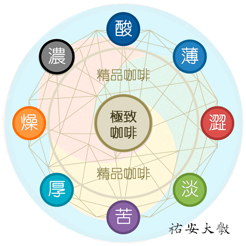 美式咖啡–>精品咖啡–>極致咖啡,這是「極致咖啡」處所的位置。「極致咖啡」源自於「精品咖啡」,但卻截然不同。所以,「極致咖啡」不僅是臺灣特有風味黑咖啡,更是一種全新黑咖啡類型。