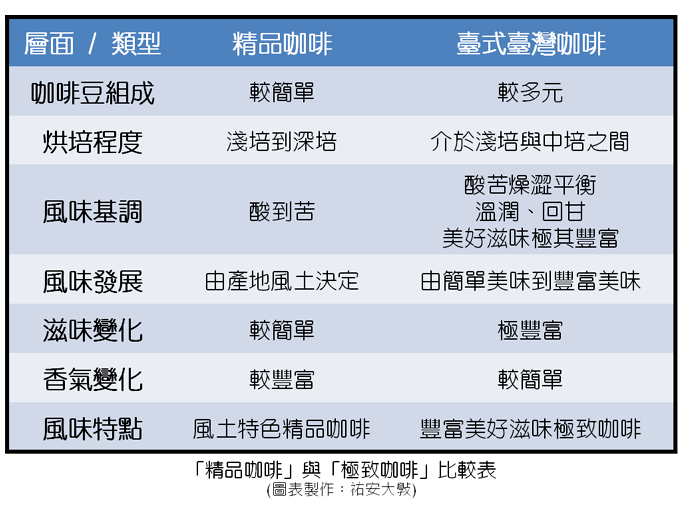 也就是說,「精品咖啡」是由「咖啡生豆烘培師」與「咖啡熟豆沖煮師」合力而成。「極致咖啡」則是由「咖啡生豆烘培師」、「咖啡熟豆調配師」與「咖啡熟豆沖煮師」合力而成。