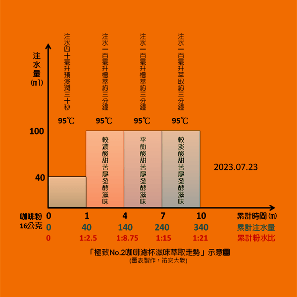 預浸潤約30-60秒,每次注水慢速萃取約3分鐘,3次注水萃取約需9分鐘,共計約10分鐘,總粉水比約1:21。若覺得滋味較濃厚,則可用適量熱水稀釋。