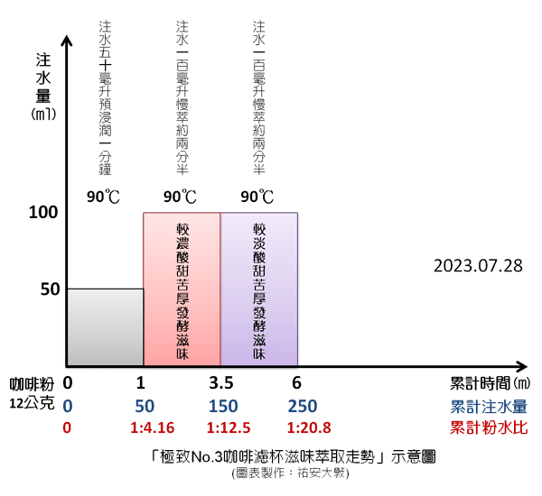 「極致咖啡機」擁有超高的萃取寬容度,預浸潤的注水量,只要能夠看到咖啡粉有明顯膨脹,且咖啡液有在往下滴即可。至於預浸潤時間長短,則可以憑個人感覺拿捏,無需使用電子秤、計時器測量。