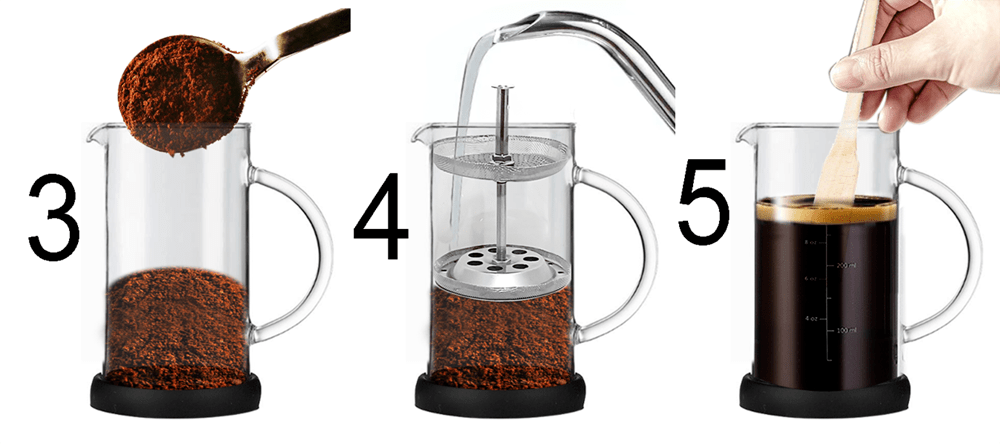 5.攪拌淬取:完全取出「推壓桿」後,以攪拌棒或長柄湯匙適度將咖啡粉均勻攪拌,然後再放入「推壓桿」於咖啡液上方並蓋上蓋子進行浸泡淬取。中深培咖啡豆依烘焙深度約浸泡90-120秒,淺中培咖啡豆約浸泡150-180秒。此過程中,咖啡粉渣會開始緩慢自然沉澱。
