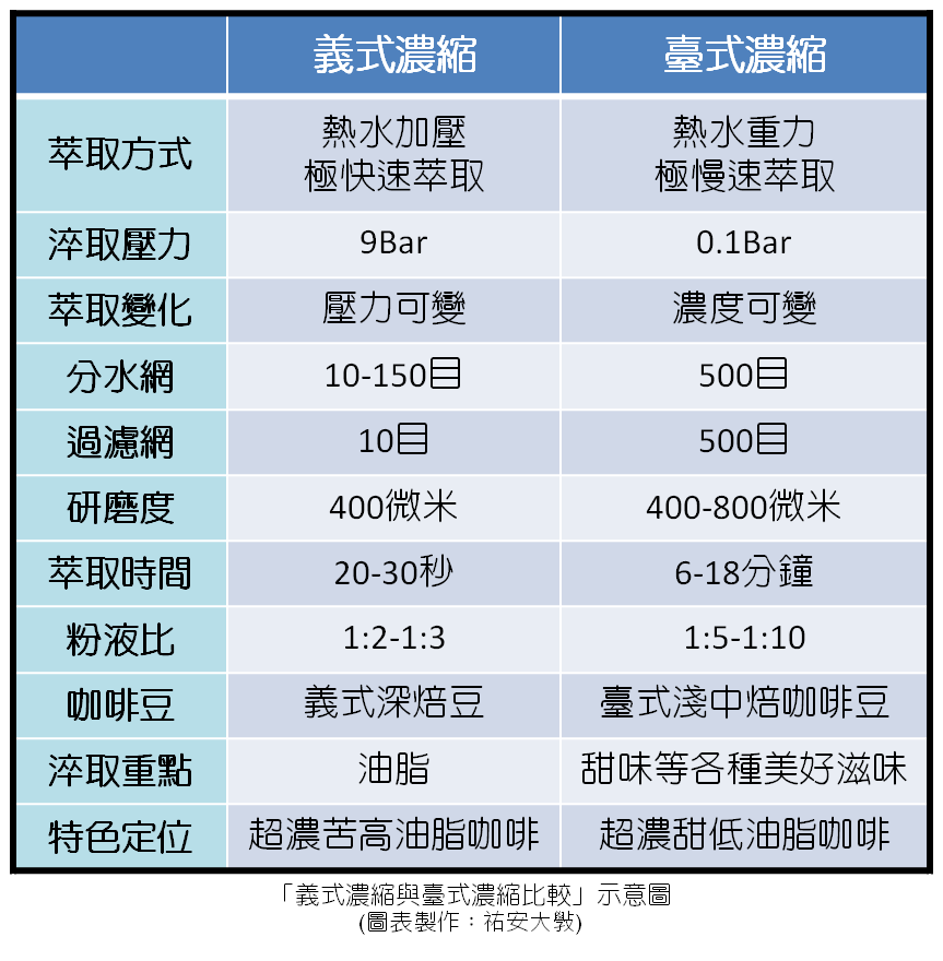 「微壓力濃縮咖啡淬取法」係使用多層次高密度分水網進行「微壓力極致平衡深度緩慢淬取」,有別於既有濃縮咖啡的「高壓力快速淬取」。其與「義式濃縮咖啡」的差異,在於「微壓濃縮咖啡」的粉液比較高,為1:5-1:7,雖無明顯油沫但溫潤且甜感高、滋味豐富,更適合臺灣人飲用。