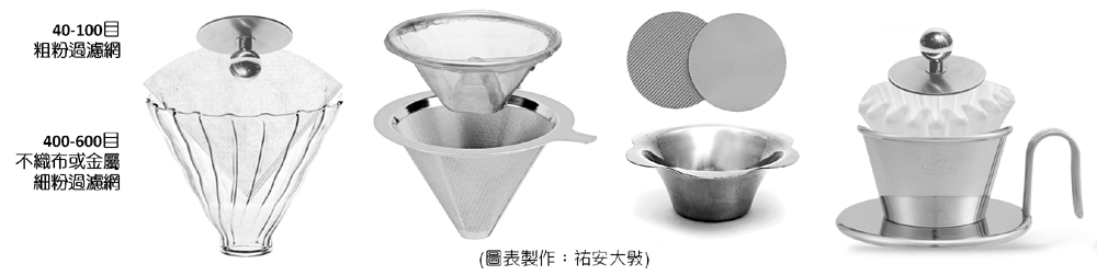 若是要萃取較苦的中深焙咖啡豆,則可使用100目800目金屬或不織布雙重過濾網。當然,義式極深焙豆原本就不適合用來手沖,不建議使用。